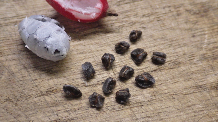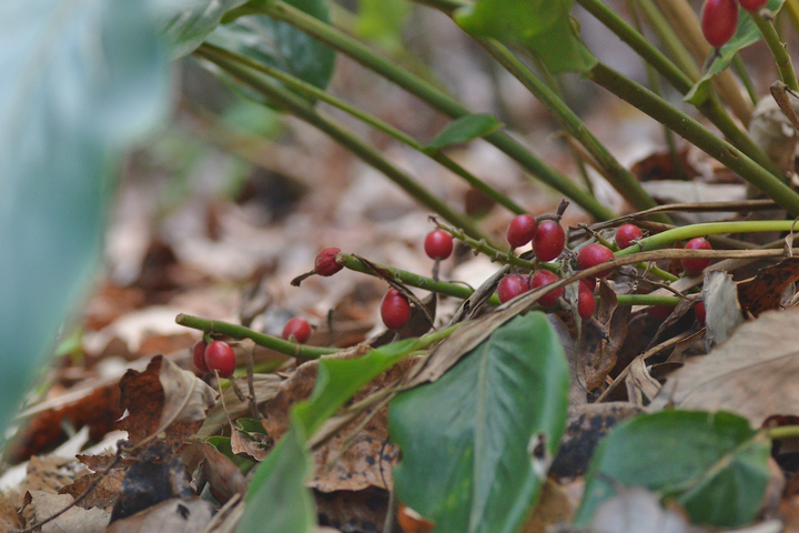 1月上旬。 1月中旬。 3月上旬。 3月中旬。とても日当たりの良い丘の上の直ぐ近く・・・ヤブとは言え、とても暖かな場所で芽が出てました♪ 4月中旬。 花。5月中下旬。 葉。繊維が強いのでこれは食べれない・・・ 6月中旬。 7月下旬。 実。11月中旬。 ハナミョウガ。 ヤブミョウガだと思い込んでいたら・・・花が違う・・・花が咲いて初めて知りました・・・ハナミョウガ。 良く調べたら葉の付き方も全然違いました。 ちなみに、このハナミョウガはショウガ科。ヤブミョウガはツユクサ科だったのでした。 紛らわしい余談♪ 市販されている普通のミョウガの食材として、芽の部分を“芽ミョウガ”、花の部分を“花ミョウガ”と呼ぶ事があり ます♪ 根・茎・葉が食用となります。 柔らかな芽を甘酢で♪ 2024年にミョウガの調べものをしていた時に、“芽ミョウガ”と言うものを知り、その時に、ミョウガの芽だけでなく、このハナミョ ウガの芽も美味しい♪と、書いてあったホームページを見つけたんです・・・が、既にそのページは分からなくなってしまいました・・・ 翌年の2025年、やっと出て来た芽♪ 勢い余って・・・何故か・・・生のまま甘酢に漬けて・・・食べた感想は、少々土臭い感じ♪ 次はちゃんと湯通ししてから頂いて見ます♪ 左上:若い葉、右下:若い芽。 4月中旬。繊維が強いので、若い葉を摘むときは特に柔らかいものを選びます。 若い芽は根元も柔らかいのでお奨め。 お浸しで頂きました。 摘むとツンとする香り、茹でると部屋がツンとした香りに、食べると口の中にツンとした風味が広がります・・・爽やかさだけであればと ても美味しいのですが、若干、土臭い感じがあるのが残念・・・酒のツマミに味噌を付けて頂くのも良いかも知れません。 ツボミの玉子焼き。4月下旬。 まだ開く前の花茎を採取しました。さっと湯通ししてから卵と一緒に玉子焼きに。 ピンク色が混ざった綺麗な玉子焼きをイメージしていましたが、残念ながら熱を加えると紫色になってしまいました。 見た目は残念ですが、新芽同様に僅かに爽やかな風味を感じる玉子焼きになりました。 1月に実を採取しました。 実の中身は、ほぼ種ばかり!! そして種の形はそれぞれイビツな形でした。 これをすり鉢で摺って・・・この時点でス〜っとする清々しい香りが漂います♪ ハツに♪ 普通に違和感なく美味しく頂けました♪ 風味はキツくもなく、変なエグみなどもなく、これは普通に使える香辛料です♪ お好みでどんな料理に入れても良さげです♪ ギョウザに。 写真では、手前のタレだけでなく、奥のギョウザ本体にも掛けたのがわかるでしょうか・・・ ハナミョウガの種がある時期に、ギョウザを食べようとして、ふいに思い出したのです♪ 酢醤油にラー油を垂らして、ハナミョウガの種子を・・・ほんと、全然悪くない♪ 違和感もなし♪ ・・・ふと・・・花椒(ホアジャオ)を連想しました♪