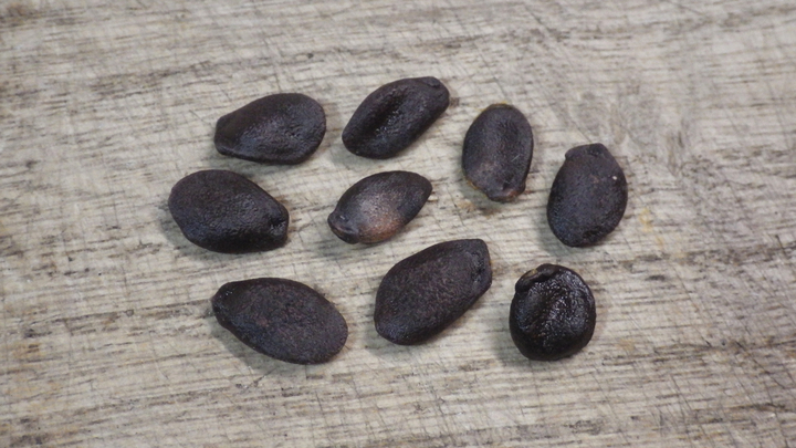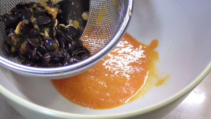 1月上旬。 8月上旬。 葉が可愛かったので♪ 8月下旬。夜11時。夜にしか咲かないのです。 キュウリなどとも良く似たウリ系の葉です。右はつぼみ。 未熟果。9月上旬。 9月中旬。 10月中旬。 特徴的な赤い実があちこちで色付き始めていました。 やや黄色い実・・・葉っぱの形を見て・・・もしや! キカラスウリ!? ・・・と思ってしまいました。 実際には・・・葉の表面には毛があるので、ただのカラスウリです。 10月下旬。 黄色い実ですが、緑〜黄色〜赤へ・・・色付いていく途中の状態なのです。 実の印象が強すぎて葉の形は・・・こんな感じ。 タネ。 カマキリの顔にそっくりですが、昔から“打ち出の小づち”に喩えられ、お財布に入れると良いと言われています。 カラスウリ。 カラスウリの中でもキカラスウリが食用になるのは知られていますが、普通のカラスウリも食用とする事が出来る様です。 若葉の他、未熟果は、塩漬けや糠漬けで頂けます・・・と言うことで私も食べてきましたが、今のところ・・・若葉は美味しく頂けます が、未熟果はエグミが強く食用には少々厳しい感じです。 芽・葉を使った料理: ゴマ和え。(カラスウリ) 8月下旬。柔らかな葉を使いました。 夏に食用にできる貴重な食材・・・柔らかくクセもなく美味しく頂けました。 お浸し。(カラスウリ) 6月下旬。僅かに採取できた芽を使ってみました。 長いツルもそのままに・・・量も少なく・・・まるで、フランス料理か! 実のエグミのイメージが強い分、意外にもエグミも無く美味しく頂けた事に感動してみたり・・・ シーチキン和え。 7月中旬、芽の先端、普通に曲げてポキッと折れる部分を採取しました。 だいたい・・・5cm程度。 これは普通に美味しいです。 夏になり、あらゆる植物が硬くなる時期・・・こんな時に美味しく頂ける貴重な食材でもあります。 花を使った料理: 花。ポン酢。(カラスウリ) 咲き終わったばかりのツボミと、直ぐにでも咲きそうなツボミだけを使いました。 サッと湯に通したら水気を切ってポン酢で。 僅かに苦みを感じる事もありましたが、全く問題ないです。 実を使った料理: 漬けた直後。 1週間後。 熟成してグラスへ注いだ所。極僅かに色がありますがほぼ無色です。 カラスウリ酒。(カラスウリ) 未熟果を使います。 実の量は5割として、約1週間で実は取り出す。 3〜4ヶ月程度で熟成して頂く事ができます。 これは飲み難い・・・口に含んだ瞬間は、キュウリの様な爽やかな瓜系の風味なのですが、その後、苦味が訪れ・・・最後にエグ味が残り ます・・・ お酒で割って頂きます・・・ ノーマルカラスウリの青い実を何とか食べる事が出来ないか・・・ ネットを検索するとカラスウリの実を食べる事ができるとの情報が見つかるのです・・・ 色々な方がチャレンジして断念しているようです・・・“楽しい野生食”を書かれた木佐森さんも断念したか・・・ ※本を書かれた時点での事なので、現在は克服しているかも知れません。 ただ、これは“キ”カラスウリの事を書いているだけで、ノーマルカラスウリでは無理なのでは!?とも思いながら・・・ ここからは実験。 塩漬けして2週間後。 大きいものは半分に、小さいものはそのまま漬けました。 塩を洗い流して2時間ほど真水に浸けてアク抜きしました。水は途中で交換しました。 さて・・・口に入れたら・・・ややショッパイ! ・・・から・・・だんだんエグ味が・・・これはダメだ。 今度は切って種を出して塩漬けしてみました。 約1週間後、2時間水に晒して塩分を抜いて・・・ ショッパイ! エグくはありませんでしたが、これはショッパイ。 もっとシッカリ塩抜きできれば良いかも。 これに衣を着けて天ぷらはどうかな? もちろん、食べる時は塩を掛けずに頂くのです。 一つ上と同時に、こちらも切って種を出した後、味噌に漬けたもの。 約1週間後、味噌を洗い流して・・・ エグ味も感じず悪くない・・・ただ味噌の風味が濃い。 塩漬けのものよりは、こちらの方がお酒のツマミに良いです。 塩漬けしていたものを一昼夜真水に浸けてアク抜き&塩分を取り除いて・・・今度は味噌に漬けて2週間。 ・・・そこまでするか・・・と言う感じですが、アクも抜けてお酒のツマミになりました。 ただ、美味しいと言うわけでもないので、苦労に見合わないです。 もっと良い食べ方はあるのか??? 素揚げ。(カラスウリ) アクの強い野草も揚げれば美味しく食べれる♪ カラスウリは!? で、早速♪ 良く火が通るようにスライスして・・・ 結果、苦い!無理! 味噌漬け。 アクがハンパないクルミを塩に漬け、味噌に漬け・・・3年後に食べれる!! ふと・・・カラスウリでもできる!? で、挑戦!! 使ったカラスウリは、緑色でMAXサイズのちょい手前のものでした。 写真の様に輪切りにした後、塩に漬けこみ1ヶ月。 取り出したら、また新しい塩に漬けこみ1ヶ月半。 今度は味噌に漬け込み4ヶ月と20日後・・・合計半年ちょい! さてさて・・・ 皮が硬いかと思いき