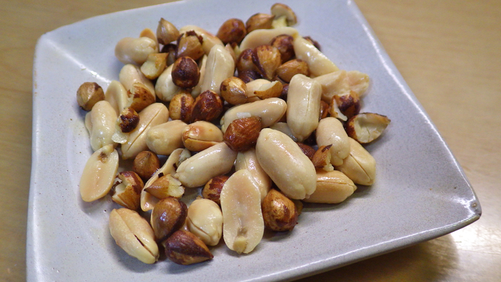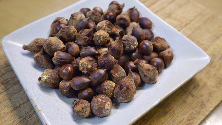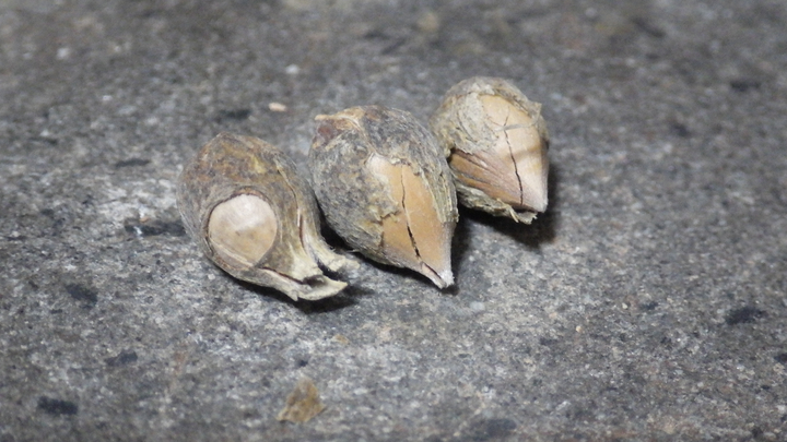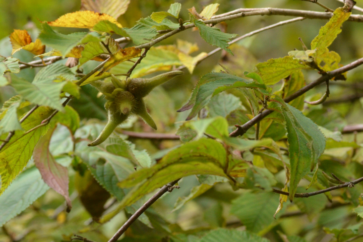 8月5日。 8月27日。 9月9日。 2025年9月23日。 ネットを検索しまくり・・・この頃に採取したほうが良いと判断!! 先端は僅かに枯れ始めてる!? 人生初採取はこの時♪ 2025年10月6日。 9月23日に採取して頂いて・・・美味しかったけど時期的に少し早かった・・・で♪ 約2週間後に様子見♪ 意外と見た目は変わって ない・・・まだまだ!? 2025年10月20日。 さらに2週間後・・・先端が枯れ始めていると言うより・・・丸くなってる実のある部分が何となく黒っぽく・・・腐ってるわけ じゃ・・・ ツノハシバミを発見した今年は、最終的にこの状態で採取しました♪ 2025年11月2日。意外とこの頃でも良さげでした♪ ツノハシバミ。 秋に実を頂くことができますが、刺毛があるので、採取の際は気を付けてください。 ネットをあれこれ検索し、9月末頃では獣に食べられてしまったとの情報を見つけ、初採取は9月23日にしたのですが、まだ皮と実が一 体化してる状態・・・美味しく頂けたのですが、もっと後でも良いでしょう♪ それから、2週間後に訪れたのですが、外見に変化が無かったので採取せず・・・ さらに2週間後に訪れた時は、若干、丸みを帯びた部分が黒っぽくなっていたので、手の届く範囲のもの全て採取してしまいました。 結果、私の住む中部地域では、10月末〜が採取の時期だと思いました。 9月23日。 採取時期をネットで検索すると、当然ですが長い日本・・・時期にずれはあるのですが、9〜11月頃か・・・ さらに、9月下旬頃には既に動物たちに食べられてしまったとか・・・木が沢山あれば多少た食べられても残るのですが、見つけた木は一 本だけ!! 9月上旬・中旬にも行きたい気持ちを抑えて・・・なんとか下旬まで我慢したんです!! そして今年は運が良く、台風が来なかった!! 台風で木の実が壊滅状態になる事は何度も経験済み!! ・・・あれこれ書いてしまいましたが、兎にも角にも♪ 初挑戦の今年は、9月23日に少しだけ採取しました♪ このまま日陰でカラカラになるまで乾燥させます。 カラカラに乾燥させた後、外皮を剥いたもの。 トゲ対策で2つのペンチを使って・・・剥くのがメチャ面倒でした・・・ あまりに面倒なので、一部はライターの炎で炙ってトゲを燃やしたり・・・ とにかくティッシュでゴシゴシしてトゲを落としたり・・・ トゲを何とかしてしまえば、剥くのは簡単になります♪ 中身を取り出したところ・・・分かってましたが、外皮を剥いて小さくなり・・・殻を割ってさらに小さく・・・ 右下は薄皮を剥いたもの。 このまま生でも頂けるので食べてみたら・・・普通に美味しいナッツ系でした♪ 炒ったもの。 ネットで得たほとんどが、生より炒った方が美味しいとあったのでやってみました♪ 薄皮付きですが、全く問題ない♪ これは普通に美味しい、少し甘みのあるナッツでした♪ 10月20日に採取。 手の届く範囲だけで採ってみたら・・・想像の倍以上ありました♪ 手を伸ばせば、まだありましたが自粛♪ これをカラカラに乾燥させたら・・・ 左手にペンチ、右手にハサミで・・・ほんと、面倒&取り扱い注意!! ひとつひとつバラして長いツノ部分は切り取りました♪ が!! まだまだ!! このトゲを何とかせねば!! で、思いついたのが↓♪ ペットボトルに入れて、シェイク&シェイク♪ 取れた!! が!! この後どうする!? ※口が狭いので出し入れが面倒・・・口の広い容器の方が良いです♪ なんとなく、水は使いたくなかったので、砂で♪ 砂漠の民は水の代わりに砂を使う・・・私も砂で食器を洗った事があるのですが、これが綺麗になるんです♪ それは置いといて・・・ ※もっと大きなザルの方がやり易いです。今回は2回に分けて洗いました♪ トゲが取れました♪ これなら素手で簡単に中の身が取り出せる♪ ペットボトルの中のトゲも綺麗に取れて・・・帰りは元のペットボトルへ入れて帰りました♪ シイの実、ツブラジイの実と一緒に炒ってみました♪ お酒のツマミに♪ 今までペンチで割ってました・・・数が少なければこれでも良いのですが、結構な確率で殻ごと身を潰してしまったり・・・で♪ 私はこんな時、MY石器を使います♪ 安定した石の上にハシバミを置いたら、握りこぶし程度の石でコツンって叩くんです♪ これが、想像しただけではかえって難しい気がするのですが、実際にやってみるとペンチよりも簡単楽ちん♪ 次から次へとパリッパリッと丁度よい割れ具合に割っていくことが出来るんです♪ もちろん時々失敗も♪ バターピーナッツ&ハシバミ。 風味よく美味しいのであっという間に無くなります♪ 作り方: 1、ビーナッツとハシバミはフライパンで香りが出るまで煎ります。 2、バターを加えて軽く絡めたら塩を振って火を止めます。 3、キッチンペーパーの上に出して余分な油分を取ったらお皿に盛って完成♪ 軽く炒ってから砕いてパスタへ。 今回は混ぜるだけの簡単ペペロンチーノと一緒に使いました♪ シンプル過ぎて、ある意味辛いだけ・・・の簡単ペペロン