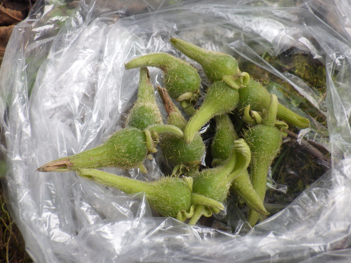 8月5日。 8月27日。 9月9日。 ツノハシバミ。 秋に実を頂くことができますが、刺毛があるので、採取の際は気を付けてください。 9月23日。先端は僅かに枯れ始めてる!? 採取時期をネットで検索すると、当然ですが長い日本・・・時期にずれはあるのですが、9〜11月頃か・・・ さらに、9月下旬頃には既に動物たちに食べられてしまったとか・・・木が沢山あれば多少た食べられても残るのですが、見つけた木は一 本だけ!! 9月上旬・中旬にも行きたい気持ちを抑えて・・・なんとか下旬まで我慢したんです!! そして今年は運が良く、台風が来なかった!! 台風で木の実が壊滅状態になる事は何度も経験済み!! ・・・あれこれ書いてしまいましたが、兎にも角にも♪ 初挑戦の今年は、9月23日に少しだけ採取しました♪ このまま日陰でカラカラになるまで乾燥させます。