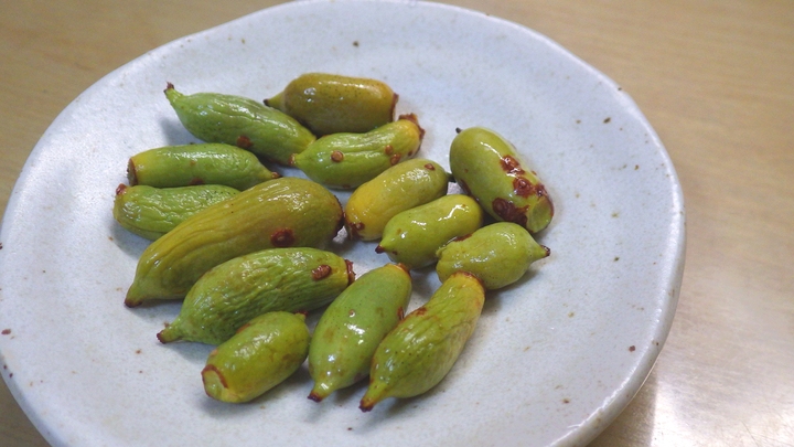 7月中旬。 7月下旬。 8月下旬。 右上の異形の実は、虫えい果です。 10月中旬。 マタタビ。 2025年にして初めて実を採取することが出来ました♪ マタタビと言えば、ネコ♪のイメージですが、その実は食用(もちろん人間の)にもなります。 生で♪ 熟したものは生でも頂けるそうで♪ いざ、人生初♪ 表面はややしっかりしてて、中は柔らかい・・・これは熟したカキっぽい雰囲気♪ もちろん、風味は違うのですが、熟した実!! でした♪ 塩漬け。 約1ヶ月漬けてました・・・一昼夜塩抜きして♪ 塩味と・・・例えようがない!! 雰囲気だけで言えば、お酒のツマミのピクルス的な!? マタタビ酒。 今回のように普通の実や、虫えいの実などを使います。 採取したまま使う場合や、数日天日干しする方法もあるようです。 ヘタ部分は取り除いて浸けます。