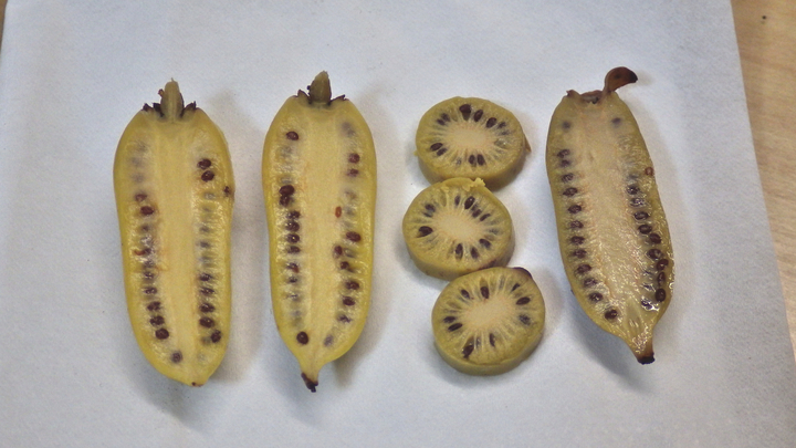 7月中旬。 7月下旬。 8月下旬。 右上の異形の実は、虫えい果です。 10月中旬。 マタタビ。 2025年にして初めて実を採取することが出来ました♪ マタタビと言えば、ネコ♪のイメージですが、その実は食用(もちろん人間の)にもなります。 実を割って見た所。 生の時に撮り忘れ・・・サルナシ酒を作って取り出した実です。 縦に長いですが、キウイフルーツみたい♪ 調べたら・・・マタタビもキウイフルーツも、同じマタタビ科マタタビ属でした♪ 納得♪ 生で♪ 熟したものは生でも頂けるそうで♪ いざ、人生初♪ 表面はややしっかりしてて、中は柔らかい・・・これは熟したカキっぽい雰囲気♪ もちろん、風味は違うのですが、熟した実!! でした♪ 塩漬け。 約1ヶ月漬けてました・・・一昼夜塩抜きして♪ 塩味と・・・例えようがない!! 雰囲気だけで言えば、お酒のツマミのピクルス的な!? マタタビ酒。 今回のように普通の実や、虫えいの実などを使います。 採取したまま使う場合や、数日天日干しする方法もあるようです。 ヘタ部分は取り除いて浸けます。