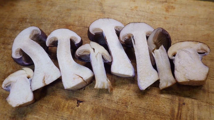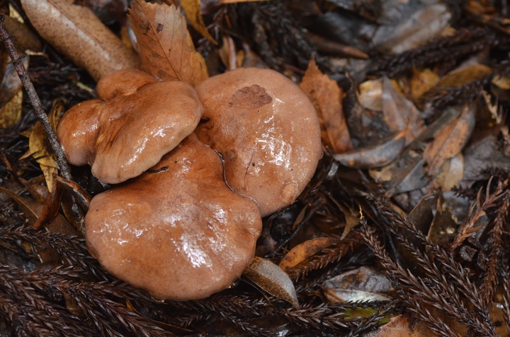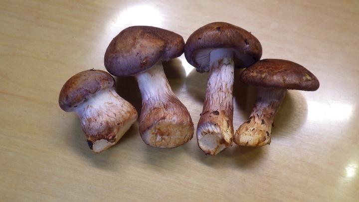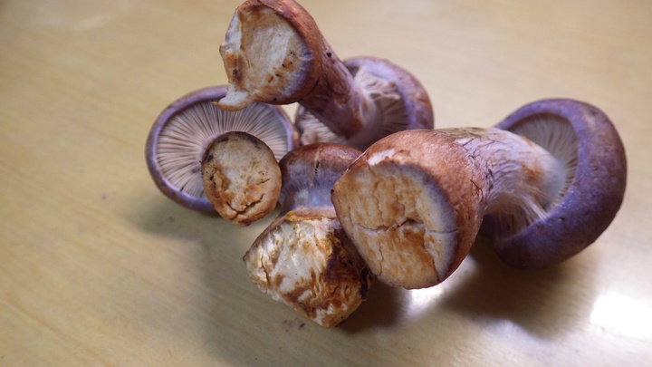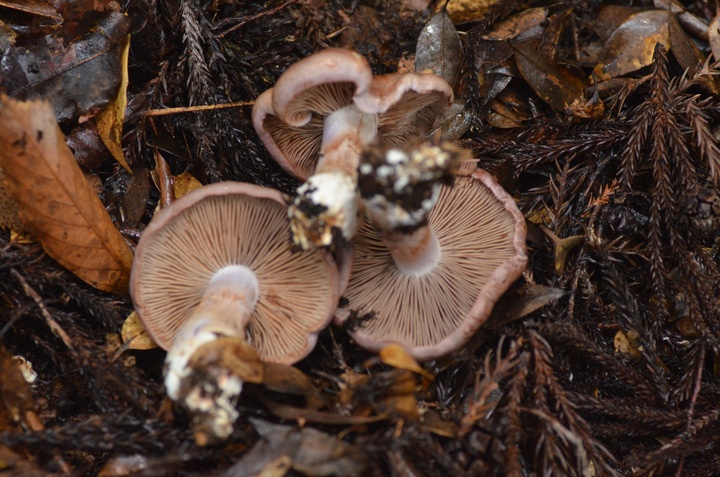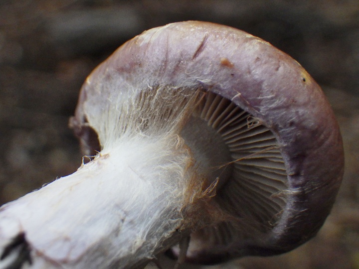 傘の表は茶色。 裏返したら、僅かに紫色! 少し古いかな? こんな状態のものがボコボコあちこちに・・・もう少し早ければ・・・ 僅かに見つけた若いものにはクモの巣状の膜。 あらためて♪ 僅かに見つけた若いもの。 以前、頂いた事がある・・・カワムラフウセンタケ!? が!! 傷つけても濃い青色に変色しない・・・ フウセンタケモドキ。 ほんと!! このフウセンタケモドキとカワムラフウセンタケは似てます・・・ が♪ もし間違えても、どちらも食用なので安心して下さい♪