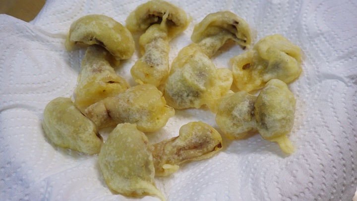 半分に切って天ぷらに・・・わざわざ写真を撮った事に意味は・・・ありません♪ 天ぷら。 普通に美味しいキノコの天ぷら♪ パラパラと塩を振って美味しく頂きました♪
