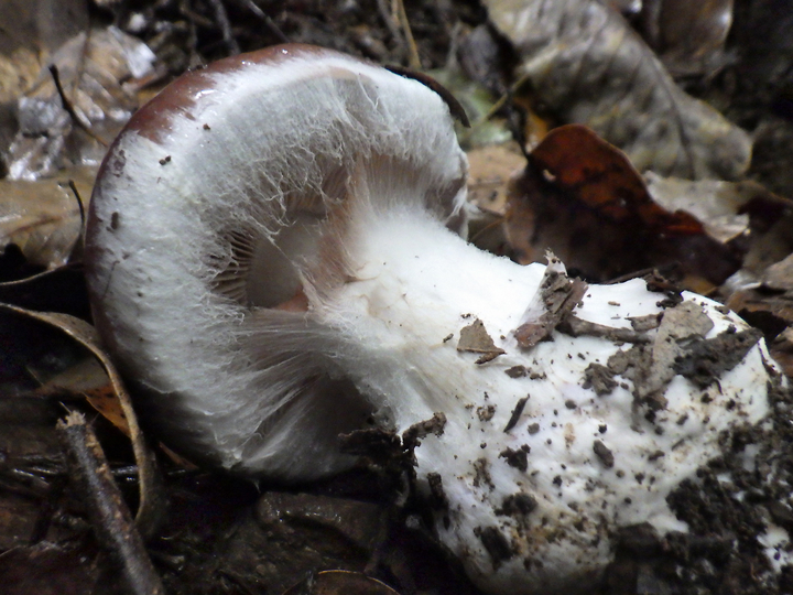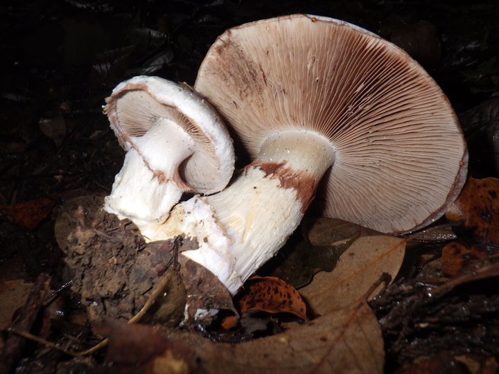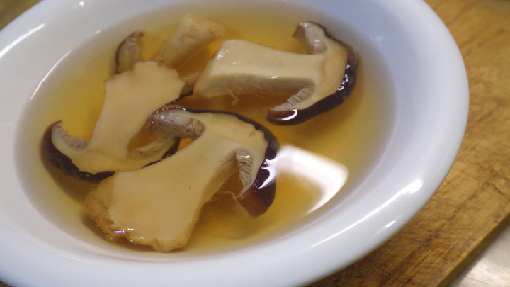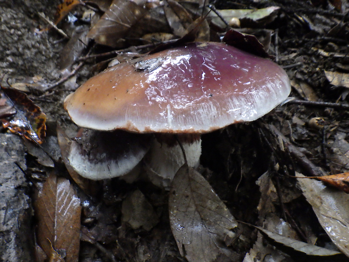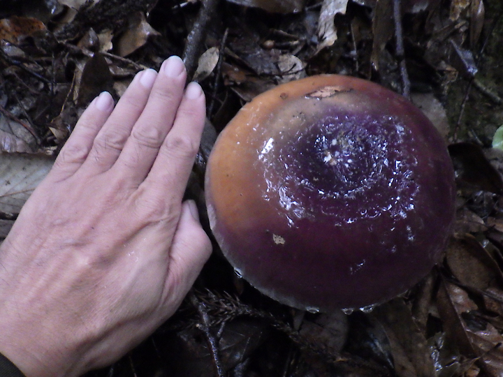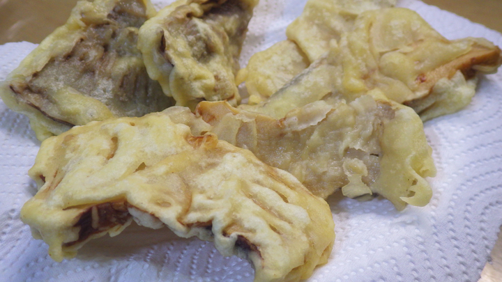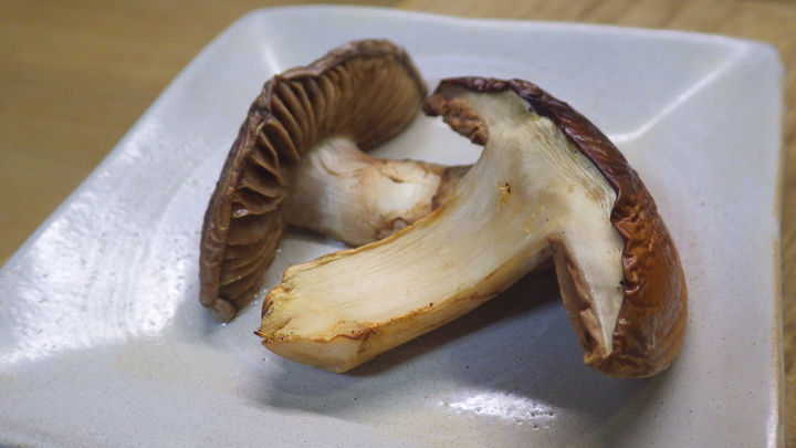 デカくて紫色&褐色でヌルヌル〜♪ 幼菌。 傘の直径は15cmありました。 柄は指3本分もあって存在感がハンパなかった♪ ムレオオフウセンタケ。 石がある所周辺で見られるキノコ・・・この場所は急な上りの山道で、ここ数年の強雨で表面が削られて岩がむき出しになってきた場所で した。 名前の“ムレ”は“群れ”・・・まとまって生えます♪ 上の写真の時は、5本だけでしたが、1本がデカ過ぎ♪ こんなデカくて、場所によっては大量に発生するキノコですが、これが高値で取引されるようです♪ このキノコに限らず、キノコは消化しにくいもの・・・大きいのでつい大量に・・・食べすぎ注意♪ 網焼き。 焼くと甘くなって美味しいとの情報があったので、一番小さかったものを焼いてみました♪ 結果、これは美味しい♪ おすすめ♪ 食べすぎ注意♪ 天ぷら。 手前から右上にかけてが柄、左上の2つが傘の一部です。 シンプルに塩をパラパラ振って♪ キノコ風味とボリュームが良い♪ このキノコ、和風が合う、汁物が合うとの情報ですが、強すぎない丁度よいキノコ風味は、シンプルな塩だけの天ぷらも美味しいです♪ 食べすぎ注意♪ 炒めもの。 豚コマと一緒にバター醤油炒めに♪ 肉(脂)との相性も良いです♪ 食べすぎ注意♪ すまし汁。 ネットで調べたおすすめの料理です。 シンプルですが、風味よく、これは美味しい♪ 食べすぎ注意♪