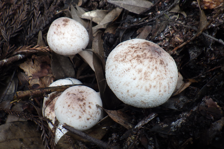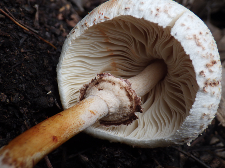 9月末。 10月中旬。木くずの山から生えてました。 ザラエノハラタケ。 傘表:帯紫褐色の鱗片に覆われる。中央が濃い。 傘裏:ヒダは、白色→ピンク→褐色に変化。密。 柄:ツバがあり、ツバより下はささくれる。 食用ですが、人によっては胃腸系の中毒を起こす場合もあります。 私の本では・・・ 1冊は、食用。 もう1冊は、食用だが人によっては強い胃腸系の中毒を起こすことがあるので注意。 さらに1冊では、毒キノコ扱いです。 さてさて・・・みなさんはどうする!? 似たキノコに、ナガグロモリノカサ(毒)があります。 傘表は同様に中央が濃い暗褐色の鱗片に覆われますがとても細かい鱗片です。
