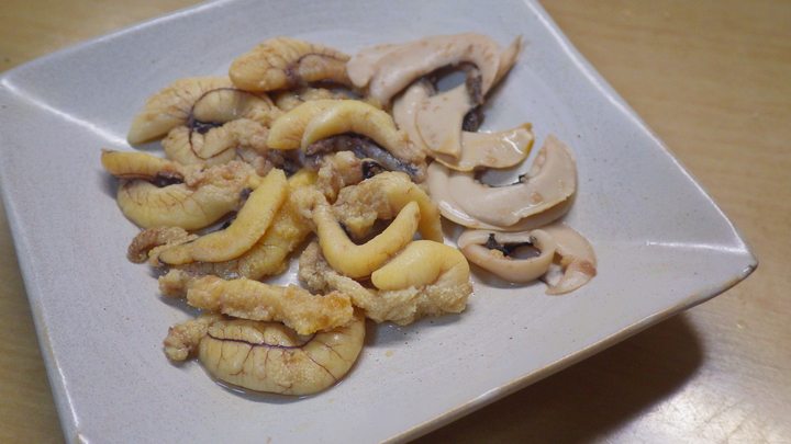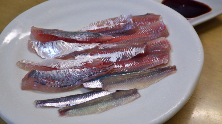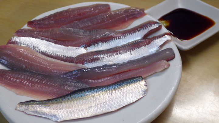 雪がちらつく程の寒い2月、大群が港の中に入ってきて海が黒くなりました。 20cm超。 体長23.5cm。 これが最大サイズ程度かと思いましたが、調べたら30cmにもなるとか。 写真中央より左側。 マイワシ <真鰯> 写真では分かり辛いですが、体に黒い点が並びます。 このイワシもウロコが取れ易いです。 大部分がカタクチイワシです。 口はでかい。まるでジョーズ。 カタクチイワシ <片口鰯> ウロコがとても取れ易く、身も柔らかです。 包丁を使わず、手でしごいて捌く事ができます。 とても口が大きいので自分の体の半分程もあるルアー(弓角)に食って来た時がありました。 ウルメイワシ <潤目鰯> 大きい目・・・文字通り、目が潤んだ感じなので直ぐに分かります。 円筒形でコロンとしてます。 中央は、コノシロ、両脇がカタボシイワシです。 腹側はコノシロの様に鋭角なのですが、背中側はコノシロと違い、丸みを帯びます。 カタボシイワシ <肩星鰯> エラにある三角形マークが名前の由来で特徴です。 温暖化により、生息域が北上しています・・・2024年にして初♪ イワシ。 どのイワシも足が早い(鮮度が落ち易い)魚なので、しっかり保冷して家に持ち帰りましょう・・・ イワシは海中の豊富な栄養分を含んでいるので、フィッシュイーター(魚を食べる魚)にとっては、とても重要な生き物でもあります。 ※当初、トウゴロウイワシとギンイソイワシも一括りにしていましたが、種が違う&食べ方に違いもあるので、別枠にしました・・・ 釣り方: サビキで釣ります。 回遊があれば入れ食い状態になりますが、無ければ全く釣れません・・・ サビキの種類がその時の環境(海の色、太陽の位置など)にあえば、エサの無いサビキだけで大漁に釣る事ができます。 カタクチイワシの白子と真子。 4月上旬、大型のカタクチイワシが数釣れ・・・捌いたら、白子や真子が・・・これは!! 茹でようかとも思ったのですが、捌く際に破れたものもいくつか・・・これを茹でてしまうとバラバラになって回収不能になるのでは!? で、結局、お酒で洗ったら醤油を掛けて頂いてみました。 これは悪くない!! 甘味と・・・この風味・・・ナマコのコノコ・コノワタの感じに似てる♪ 6月、体長19cmほどのカタボシイワシを捌いたら白子や真子が出てきたので、集めて軽く湯がいてみました♪ ほんと美味しい♪ 右上の皿の左がウルメイワシ、右がギンイソイワシの刺身です。 こちらは、トウゴロウイワシ(奥)とウルメイワシ(手前)です。 マイワシ。写真中央。脂が乗って柔らかく美味しいです・・・ マイワシ。 大型のマイワシは簡単ですが3mm程度の幅で骨切りしました。 脂で柔らかくまったりと・・・美味しすぎる・・・ 欲を言えばもっと丁寧に血抜きすれば良かった。 見るからに美味しそう・・・この銀色と赤色のコントラストが食欲をそそります・・・ 手前がマイワシ。奥はサッパ。 体長20cmを超えるマイワシが釣れたのですが、大型のイワシはこの1匹だけ・・・これは是非刺身に・・・脂が乗っていたので冷蔵庫 へ入れたら表面の脂が 固まりました・・・ 半身丸ごとかぶり付いて口の中へ・・・体温で溶ける脂・・・まったりと美味し過ぎる・・・ 大型のサッパは、骨切りしてコリコリして美味しいです。 手前がマイワシの刺身。 同じ皿の奥はコモンフグを細く切ったもの。ポン酢。 右上は小さなヒイラギの唐揚げ。左上はサッパの背ごしで酢味噌。 12月中旬、僅かな釣果でしたが、少しずつ・・・いろいろな味を楽しみました。 カタクチイワシの刺身。 身がとても柔らかいので捌くのに苦労しました。手開きしました。 手前がウルメイワシ。奥はサッパ。 ウルメイワシの刺身。 私にとってはなかなかお目にかかれないイワシです。 口に入れると溶けてなくなる柔らかい身。美味し過ぎる。 カタクチイワシのカルパッチョ風。(ドレッシングの塩レモンを掛けただけです。) カタクチイワシの刺身を醤油とゴマドレで。 ひとつ上のカルパッチョと同じ日・・・ちょっと変わった食べ方をしたかったのです・・・どれも美味しかったのですが、ゴマドレだけ は、微妙・・・味はまさにゴマドレ!イワシの風味は完全に打ち消され、食感のみ!!でした。 午後から釣りを初めて・・・カタクチイワシが釣れ出したのは3時頃!! 数時間前まで泳いでいた鮮度!! 足の速い(傷みやすい)イワシを刺身で頂けるのは、釣り人の特権でしょう♪ 写真では、左の方はサッパの刺身、右の方がカタクチイワシの刺身です。 鮮度が落ちるとクタクタになってしまう身ですが、コリッコリ♪ しかも甘〜い♪ ウルメイワシ。 左上奥はサッパ、右はアジ、手前はカタクチイワシです。緑はセリ。 カタボシイワシの刺身。 体長19cmほどのカタボシイワシが数釣れたので、お刺し身に♪ 奥から、皮と血合い骨を取ったもの、皮だけ取ったもの、血合い骨だけ取ったもの、一番手前は皮も血合い骨もあるもの・・・さてさて♪ 人により好みはあるかと思いますが、私はもとも