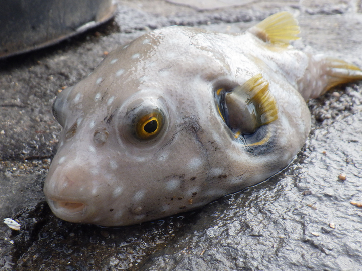 毒魚には、 ・ヒレ等に毒がある・・・アイゴ、ゴンズイ、オコゼなど。 ・身・内臓に毒がある・・・フグなど。 ・血液に毒がある・・・うなぎ、マルソウダ(サバ)など。 があります。 毒: ・テトロドトキシン・・・フグ毒。解毒剤無し。 熱を加えても分解されません。 毒性は強く死亡する場合も。 フグ毒と呼ばれますが、実際には、ヒトデ、カニ、貝、 タコ、海藻などからも検出されてます。 細菌が原因です。 食物連鎖により体内に蓄積されるので、同じ種でも 採取された地域・時期・固体により毒性の強さは 変わります。 鎮痛剤としても利用されます。 ・シガトキシン、マイトトキシン・・・シガテラ毒。解毒剤無し。 熱を加えても分解されません。 毒性はテトロドトキシンよりも弱いのですが、症状が 数ヶ月続く場合もあるようです。 貝からも検出されています。 熱帯の海洋に生息するプランクトンが原因です。 同じ種でも南方で取れた魚は要注意。 食物連鎖により体内に蓄積されるので、同じ種でも 採取された地域により毒性の強さは変わります。 中には食物連鎖の低位に位置する種でも毒性の強い 固体が存在するようです。 ※地球温暖化により中毒の発生は北上しています。 その他、毒魚ではありませんが、ヒレやエラなどが尖っていたり鋭かったりする魚は意外と多いです・・・しかも、濡れた手の皮膚は柔ら かくなっているので切れたり、穴が空いたりなどは日常茶飯事・・・釣りに行くといつも手がボロボロになります・・・ 写真上と右。 釣り上げた直後。色合いは、もっと白と黒の班が目立っている時もあります。 アイゴ。 毒:体中の各ヒレに毒があり、刺さると数時間から数日に渡って痛みが続く場合があります。高分子タンパク毒なので熱により分解されま す。 釣り上げて興奮した状態では、全身のヒレを全開にしているので注意。 小さなアイゴのトゲに軽く刺された程度では痛痒い程度です(経験済み)が、大型のアイゴにザックリいかれた場合は・・・数日に渡って 相当痛むようです(未経験)。 身には毒が無いのでヒレさえ処理してしまえば食べれます。 と言う事で、この毒魚のページに載せてはありますが、食用魚なのです。多くの方が知ってますよね♪ ハオコゼ。 毒:背ビレ、胸ビレ、口周りのトゲに毒があります。 毒成分はタンパク毒なので、熱に弱く調理する時に加熱すれば毒は無くなります。 刺された場合の荒療治として、火の付いたマッチを刺された場所に当てると痛みが消えるそうです。 私の住む地域では単にオコゼと呼んでます。 小さくても刺されるととても痛いようです・・・未経験。 身には毒が無く、味噌汁や炊き込み御飯にして食べられています。 こちらもアイゴ同様ですが、小さい・・・食用になると知っている人は少ないと思います・・・ サザナミフグ。 腹側の横スジ模様が特徴です。水色の水玉模様が可愛いです・・・ 有毒部位について不明とする情報もありますが・・・ 内臓や身に毒成分があり、身の毒成分は、内臓に比べ弱いとの情報も・・・ ただ、各都道府県で食用不可として扱っているので食べてはいけません。 外国の一部地域で食用との情報もありますが、フグに関しては・・・生息域により、毒の有無が変わるので参考にしてはいけません。 キタマクラ。 串焼き。 写真一番左がキタマクラ。その他はコモンフグです。 食べたら死んでしまうと言う事で、“キタマクラ”の名前なのですが、良く調べたら、皮が強毒なだけで、身は無毒とか・・・ 早速、串焼きにして頂いてみましたが、前情報通り・・・コモンフグがプリプリだったのに対して・・・やや水っぽい・・・これは無理し てまで食べるべきではない・・・いや、そもそも食用ではないので、食べてはいけません!! 前回よりもさらにデカイ、キタマクラをGet!・・・してしまいました・・・ 喉の辺り、尾ビレ、その間の腹側に一直線にある、蛍光青色が綺麗♪ 食べたらあかん!と、思わされます。 12月中旬・・・魚が釣れない中・・・やっと釣れた・・・これはやっぱり、頂きたい!! 写真奥は、コモンフグ、手前がキタマクラ。網焼きしました。 焦げ目が付いて美味しそう♪ これが、食べたらやっぱり水っぽい・・・ この水っぽさを克服するには・・・干物にして焼くと良いかな!? 2022年、小型だったのですが、久しぶりに釣れ・・・ひとつ↑上の感想など、とうに忘れていたのですが、なんとなく、干物にしてみ たくなって作りました。 串に刺して弱火の遠火でジックリ乾燥させたら・・・2日ほど冷蔵庫で低温乾燥させました。 これを軽く炙って・・・♪ これが、適度な歯ごたえにフグの風味、そして、香ばしい香りも♪ これは美味しいです!! ※美味しく頂きましたが、こんな事を言うのもなんなんですが・・・命と天秤に掛けるほどではありません・・・ 食べて死ぬくらいなら、食べずに生きていた方が、やっぱり!! 絶対に良いです!! フグ。 フグに毒があるのは有名ですね