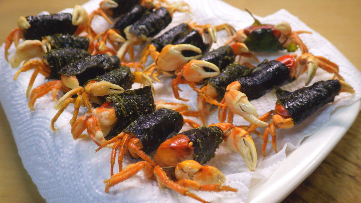 6匹居ます・・・目立つ色なので直ぐに分かりますね・・・ 滝のそばにて 黄色い個体。 サワガニ。 落ち葉のある広葉樹林内の沢などで良く見かけます。 (枯れた落ち葉や、ミミズなどを食べています。) とても目立つ明るいオレンジ色なので、なぜこの色に進化したのかとても不思議です・・・ それぞれの生息環境が隔絶されているので、地域により微妙に違いがあるようです。地域により青い色のサワガニもいるようです。 食用とする場合、寄生虫を持っている可能性があるので必ず火を通します。 殻が薄いので殻ごと食べれます。 ちなみに、東南アジアでの食べ方は、揚げる、焼く、茹でる、蒸すの他、スープや、塩漬けして柑橘系の汁を掛けて食べたり、カニペース トにされるようです。 カニペースト:カニを潰して汁を取り、香辛料(にんにくやトウガラシなど)、塩などと一緒に煮て作ります。 時期にもよりますが、100匹超も捕獲できる時があります。 湿らせたシダ類と一緒に持ち帰ると、共食いを減らせて元気なまま家まで持ち帰れます。 サワガニの前準備: 最善は、水槽にサワガニを入れて数日間絶食&糞だしをする事です。 それが出来ない場合、湿る程度の入れ物に入れ、数日間絶食させて糞を出させます。 その間に、夜寝るまでや、朝起きるまでなど、数時間だけでも完全に水中に浸けて体内の汚れを吐き出させれば、なおBESTです。 さらにそれも出来ない場合は、糞の詰まったカニのフンドシを取り除いて料理します。 サワガニの食べ方: 生きている状態でいきなり熱を加えると足やツメがポロポロ取れます。(自切と言います。) 対策として水から極弱火でゆっくり火を掛けて行くのです。 お酒を入れて酔わせても良いです。 そのまま冷凍庫へ入れて冷凍保存もできます。 糞だしすれば最善ですが、当日すぐに頂きたい時は、糞の詰まったフンドシを取り除きます。 この方法は、しっかり糞だしした物に比べると、やっぱり、味は一段下がります・・・ サワガニ料理: 緑はイノコヅチの天ぷら。 クラブ&チップス♪ サワガニの素揚げ。シンプルに塩を掛けて。 素揚げ。 写真右上に写ってますが、今回は、素揚げにしたサワガニにマヨ+醤油のタレを付けて頂きました。 余談ですが、写真左上の緑のものは、山で採ったダンドロボロギクの天ぷらです。 これは美味しい♪ この食べ方もおすすめです♪ フィッシュ クラブ&チップス。 有名な、フィッシュ&チップスをカニで作ってみました。 サクサク、バリバリ、サクサク、バリバリ♪ ビールが美味しい♪ 唐揚げ。 片栗粉をまぶして揚げました。 サバイバル11年目にして初めて♪ 素揚げよりも、風味&食感が良いのでおすすめ♪ サワガニの唐揚げ。 唐揚げ粉を使いました。素揚げと違って美味しいです。 味が濃くなるので、ビールと合います。 磯辺巻。 カニと海苔の風味が◎♪ ふとした思いつきでしたが、大正解♪ 焼いて塩を掛けて。 サワガニの甘露煮: 殻の色が変わって水分が大分抜けるまで焼きます。 醤油、みりんに砂糖を多めにして、コトコトとジックリ煮詰めて行きます。 汁が少なくなると焦げ易くなるので気を付けます。 完成。ある程度保存が利きます。 サワガニのガン漬け。 良く知られているのはシオマネキを使ったガン漬けですが、山間部ではサワガニを使ってガン漬けを作っていた様です。 1、サワガニは寄生虫が居るので湯がいてから砕きます。 2、砕き方はお好みで。写真は少々荒すぎです。ペースト状になるまで砕いても良いです。 3、唐辛子、しょうゆに、塩を2〜3割程の量を投入します。 4、2〜3ヶ月程発酵させて完成。 そのままお酒のツマミにしても良いのですが、相当ショッパイので、温かい御飯にチョッと付けたり、味噌汁に入れても、スパゲッティー に付けても意外と何に でも使えます。 ※福岡県では、がに漬け(蟹醤:かにびしお)と言う料理もあります。 生きているサワガニをそのまま臼に入れて砕き、大量の塩と鷹の爪を入れて熟成させたら、麹を入れてさらに熟成させて作ります。爪は 砕かずに残すのが良いのだとか。 ちなみに、サワガニには寄生虫がいるので生食は厳禁ですが、この料理では、大量の塩と鷹の爪を入れるから大丈夫とされています。 御飯に付けて・・・これだけでお酒のつまみになります。 サワガニの甲羅酒。オリジナル。 カニの甲羅酒は、身を食べた後、焼いた甲羅にお酒を注いで頂いたりします。 それをまねてサワガニで作ってみました。 サワガニをジックリ焼いて熱燗のお酒に漬けて頂きます。 お酒に入れる時に細かく砕くほど、カニの風味が強くなります。 お好みで砕き具合を調節します。 鍋の具に。オリジナル。失敗。 サワガニから苦味が出てしまいました。 あらかじめ火を通して下拵えしておけば成功していたかも知れません。 長崎チャーメンに。オリジナル。成功。 サワガニはあらかじめ油でカリッとなる程に火を通しておきます。 通常通り具を作り、完成前にサワガニを投