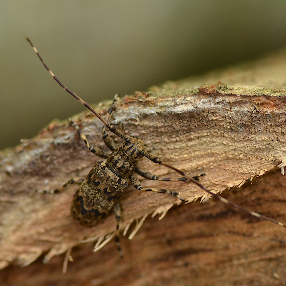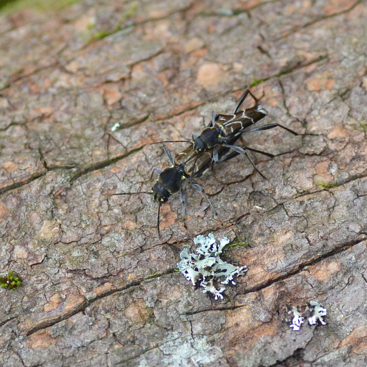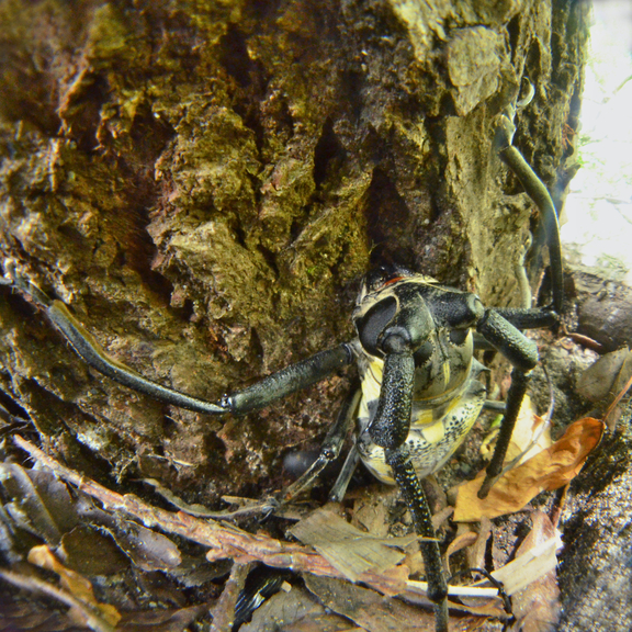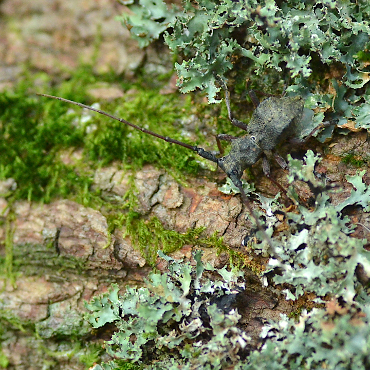 何故、ラミーに居ても目立つこんな派手な模様なのかといつも疑問でした。 偶然かも知れませんが、ラミーの枯れ葉に留まっていると目立ちません・・・ ラミーカミキリ <ラミー髪切> こちらは、写真の葉・・・カラムシの葉を食べます。 6月中旬。 7月上旬。 7月下旬。キノコの撮影をしていたら、ガサゴソガサゴソと・・・何かが近づいて来る!! 見たらノコギリカミキリ♪ ただ、延々とせわしなく歩き続けて止まらん!! あちこちウロウロ・・・歩き続けて止まらない・・・大量に撮影してやっと綺麗に撮れた1枚。 8月中旬。 触角が太く、第3節よりも第4・5節を合わせた長さの方が長いので、オスのノコギリカミキリと同定しました。 ノコギリカミキリ <鋸髪切> 体長2.5cm。これは小さな固体でした。 やたらと動き回り、触角が長く・・・掴むとキーキー鳴き・・・とてもせわしない生き物です・・・ゴキブリっぽい感じもあるので苦手な 人もいるのでは? 触角の太さによりオスとメスを、オスは第3・4・5節の長さ、メスは先端の節でノコギリカミキリかニセノコギリカミキリかを見分ける 事が出来ます。 触角が細く、先端は第11節で凹みがあるので、メスのニセノコギリカミキリと同定しました。 ニセノコギリカミキリ ノコギリカミキリととても良く似ているので、ニセノコギリカミキリと言う種を知らないと、全く気付きません。 私も新しい多くの種が載っている図鑑を買って初めてその存在を知りました。 クワカミキリ <桑髪切> 桑やケヤキの木を食べるようです。 外灯近くにて・・・だいぶ弱ってました。 ミヤマカミキリ <深山髪切> 胸のシワが特徴です。 複眼が触角の後ろをグルッと周り込んで・・・どうやって見えているのか・・・ 見つけたのは橋の下・・・河原に生えているクヌギにて。 橋には外灯があり・・・触角が片方切れているので夜間に外灯と戦っていたのでしょう・・・ 木のウロで休んでました。 ウスバカミキリ <薄翅髪切> ゴマダラカミキリ <胡麻斑髪切> カミキリムシの中で一番身近な存在ではないでしょうか。 みかん農家にはもっとも嫌われる存在・・・子供の頃、親戚のおじさん(みかん農家)が、見つけたら首を捻って殺していたのにショック でした・・・時は流 れ・・・私は普通に食べてたり・・・ シロスジカミキリ。 図鑑では体長4〜5.5cmとなっていますが、6cmは十分にあったと思います。 子供の頃からの憧れでした。デカイ!! 迫力があります。 咬まれない様に注意!! 不明。 手持ちの本やネット上の図鑑には似ているものも見つかりませんでした・・・ ゴマダラカミキリのようなガッシリした体でした。 ヒメヒゲナガカミキリ。 セイタカアワダチソウの葉の上で、体の手入れをしてました。 セダカコブヤハズカミキリ。 翅が退化して飛ぶことが出来ないため、地域により少しずつ特徴が異なるとか。 チャボヒゲナガカミキリ。 9月下旬・・・ずっと降り続く小雨の中・・・木のうろで雨宿りしてました。 ヤツメカミキリ。 サクラの木にて。一説によると、上の写真にも写っているウメノキゴケ(写真左上の緑色の地衣類)に擬態しているとも言わます。 キマダラミヤマカミキリ。 クロカミキリ。 2018年、生きているものはサバイバルを始めてから初。 ナガゴマフカミキリ。 ルリボシカミキリ。 2025年! 生まれて初めて見ました♪ ブナの育つ1,000m級の山にて。 シラホシカミキリ <白星髪切> クビアカトラカミキリ。 伐採されて積み上げられた樹木に居ました。 ヨツキボシカミキリ <四黄星髪切> カミキリムシは、派手な模様の種類が多いと、今更ながら思った2020年・・・ フタオビミドリトラカミキリ。 その名の通り・・・翅に黒い帯が2つある、緑色のトラカミキリです。 残念ながら?写真の様に黒い帯は個体により無いものもあります・・・ エグリトラカミキリ <抉虎髪切> キスジトラカミキリ <黄条虎髪切> トラカミキリの仲間。 山の中、道路沿いにある看板の支柱にて。 ネット上の写真を探し回りましたが、この模様と同じものは見つからず・・・ほんと・・・種類が多い・・・ 2025年・・・↓ひとつ下と同じかも!? ニイジマトラカミキリ。 薄暗い山の中で、歩き続けて止まらん!! ふと、別の個体が木の又に・・・そっと撮影した直後・・・歩き出した!! 人の気配を良く察知する上に、一度歩き出したら永遠に止まらない・・・ またいつか、綺麗に撮れたら差し替えます♪ ウスイロトラカミキリ。 トゲヒゲトラカミキリ。ヤブデマリの花に集まってました。 トラフホソバネカミキリ。 意外とかわいい顔です。 キクスイカミキリ <菊吸髪切> 菊に付く害虫・・・写真はヨモギですが、ヨモギもキク科なのでした。 シラハタリンゴカミキリ リンゴカミキリの仲間・・・調べたら色々な種類が・・・ 良く似たニセリンゴカミキリは、愛知県以西、このシラハタリンゴカミキリは静岡県以東です。 ※温暖化などの影響で変わって来ているかも!? ヘリグロリンゴカミキリ。 良く似ているニセリンゴ