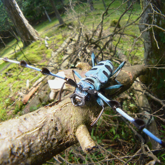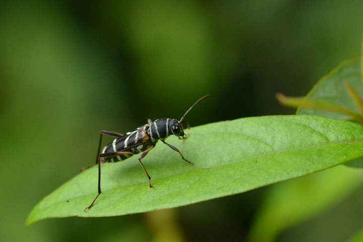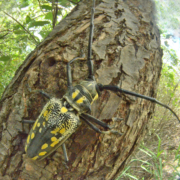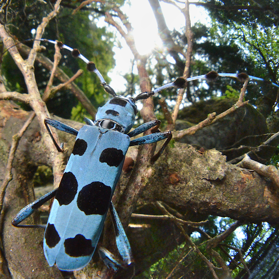 写真の葉・・・クワの木を食害するようです。 クワの木にて。 キボシカミキリ <黄星髪切> 緑色っぽいもの、水色っぽいもの・・・色や大きさなど、違う個体も見掛けます。 やはり、メスの方がひとまわりデカイです。 交尾は10数秒程度で、あっという間に終わってしまいました。 とても好奇心旺盛なのか・・・撮影していたら彼方此方でこちらを凝視・・・