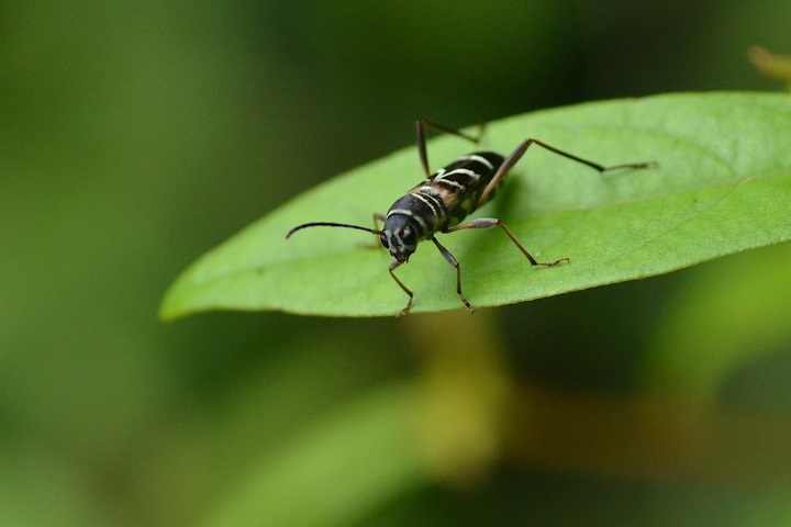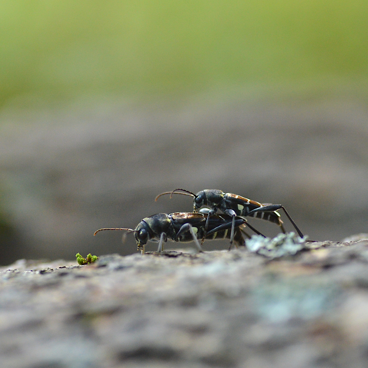 柔らかい葉の付け根部分をカジッてました。 何故か手前の個体の首に手をまわしてました・・・ センノカミキリ <栓の髪切> 別名:センノキカミキリ <栓の木髪切> 写真の様にタラノキで見掛けます。毎年、この場所に来ると良く見つかる事がわかりました。 アトジロサビカミキリ <後白錆髪切> サバイバルを始めて間もない頃に撮影したもの・・・カミキリムシとカメラの間に草があったようです・・・