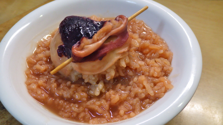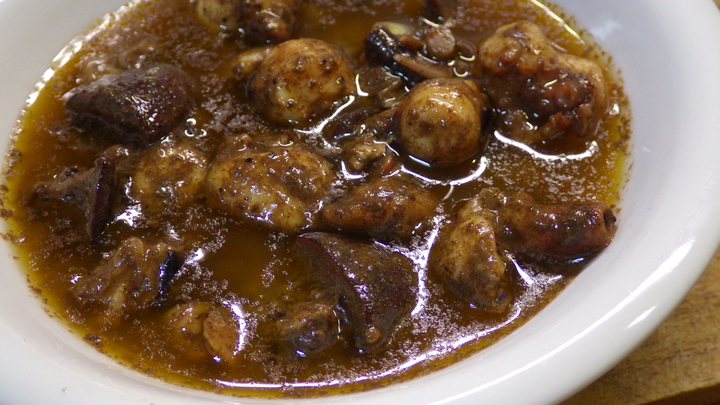 吸盤・・・人間が作った吸盤は、ガラス窓などまっ平らで無ければくっ付かないのですが、タコの吸盤は、デコボコでもシッカリくっ付き ます・・・なぜ!? 生きたタコの体以外にはくっつくのですが、その判断は脳では行なっていないとか・・・ 栄養・・・疲労回復と言えば、栄養ドリンクにも入っているタウリンですが、タコにはタウリンがとても多いので、夏バテ防止にも。 ※地域により漁業権が設定されていて採取禁止の場所があるので注意して下さい。 また、堤防でタコ壷を沈めているのを見たことがありますが、一般人(漁業権の無い人)がタコ壷を使うのは密漁となります。 タコ釣り仕掛けのひとつタコテンヤ。 色や疑似餌の取り付け方など、色々な方法があります。 タコは視覚でエサを探すので写真上のようなプラスチックのカニでも釣れます。 タコの興味をひく様にテンヤの上30cmほどに赤か白のタコベイトや白のビニールひもを付けると良いとも言われます。 この仕掛けを海底から浮かせないように底をズルズルと引きずってタコを掛けます。 こんな ふざけた ルアーでも釣れます。 昔ながらのタコテンヤでの釣りが一番オーソドックスですが、イカ釣りに使うエギで釣ったり、2本の棒を使い、一方の棒に付いた疑似餌 で誘い、もう一方の棒 に付いたカギで引っ掛ける方法の他、タコツボを沈めて住み着くのを待つ方法、カニカゴにもまれに入るようです。 ※タコの中でも、ヒョウモンダコは毒があるので注意して下さい。磯に生息しています。 咬まれると唾液からフグ毒とおなじテトロドトキシンが注入されてしまいます。 南方の海域の生物ですが温暖化の影響で生息域が北上しています。 締め方: お腹(頭の様な所)を裏返して内臓を取り除くか、眉間にナイフを入れます。 保存方法: 1、生のまま水で洗わず空気を抜いて密封し冷凍庫へ。 2、下処理して茹でてから空気を抜いて密封し冷凍庫へ。 1の方法は、とにかく簡単!しかも1年以上も保存でき、解凍時にヌメリも取れる優れもの。 2の方法は、2〜3ヶ月程度は保存できます。シッカリ空気を抜くのがコツです。スライスして小分けにすれば、いろいろな料理で手軽に 使えます。 刺身、“たこわさ”にする予定でしたら1の方法にします。 タコの食べ方: 多目の塩でヌメリをシッカリ落とします。米ぬかを使っても良いです。 ヌメリに生臭みがあるのでこの処理で手を抜いてはいけません。 タコは捨てる所がないので、内臓や口も取っておきます。 シッカリヌメリを取ったところ。 ヌルヌルからキュルキュル!! になるまでシッカリ!! 親の敵と思って落としましょう。 内蔵1匹分です。(左側です。右は足の根本部分。) 左上が肝。 ※濃い色の内蔵部分の中に触ると内容物がザラザラしている所があるのですが、これを食べるとジャリジャリしてしまいます。 この部分は切り取るか、開いて中身を洗い流します。 タコ料理: 内臓の串焼き。 茹でても焼いても熱を加えると筋肉や皮が縮み、中身が出てしまいます。 茹でてしまったほうが食べやすいです。 小型のタコ2匹分です。とても濃厚な風味でした。 アクを取ってコトコトと火を通して・・・とても濃厚・・・ 内蔵の煮物。 肝はとても濃厚・・・その他も歯応えが良かったり・・・色々な味・食感があります。 泡盛を頂きながらチビチビやるには良いのです。 内臓の肝煮。 墨袋以外の全ての内臓と、腹部(頭と思われている部分)と、頭部(足と腹部の間のもの全て)を使いました。 肝の風味とショウガが合って良いです♪ 海藻系もあるともっと良いかな!? 作り方: 1、鍋に水、酒、砂糖、しょうゆ、みりんを入れて煮立たせます。 2、タコ(肝:一番大きな丸い内臓以外)とショウガを投入して煮込みます。 3、肝を破って中身を鍋に踏襲したら、肝の袋も投入してさらに煮たら完成♪ ※肝は意外とシッカリしているので、目の粗いザルなどで濾すようにして潰すと良いです。 タコの内蔵のアヒージョ作成中。 肝を溶かし入れる前です♪ タコは足の根元部分なども投入!! キノコは山で採取したタマゴタケ、ハタケシメジなど。 タコの内蔵のアヒージョ。 これは美味しい♪ 内蔵がこんな美味しくなるとは♪ 作り方: 1、フライパンでスライスしたにんにくをオリーブオイルで炒めます。 2、香りが出たらタコの内蔵を投入してさらに炒めます。 3、肝はサッと湯通ししたものを溶かし入れます。 この時、墨はお好みで♪ 今回私は投入!! 4、最後にキノコを入れ、塩コショウで味付けし、さらに数分煮たら完成♪ 美味しかったアヒージョに醤油少々、塩コショウ少々で少し濃い目に味付けしたらパスタに♪ ひとつ上が混ぜる前で、混ぜたらこんな感じに♪ 濃厚パスタで激美味♪ たこわさ。 簡単たこわさは、下拵えして適度に切ってタレに漬けるだけ。 タレは、みりん小さじ2、しょう油小さじ2、塩少々、わさび少々。 柔らかくて美味しいです。 カルパッチョ。 タコ以外はトマトとレタスです。 タレは、オリーブオ