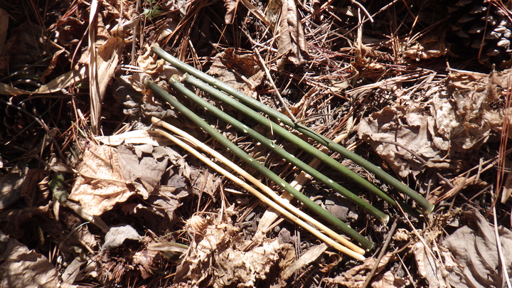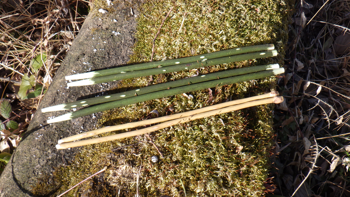 こちらは去年のお正月に使った食器など。 竹は食器作りや、その他、家作りなどにも・・・しなやかで丈夫、加工し易く便利です。 お箸作り: 2014年1月。 身近にある木でお箸になる木を探した所、赤松が気になりました。 それでは、早速・・・ 直径4cm程ありました。 とても太いのでノコギリで縦に真っ二つに。 表面をカッターで削った所。 綺麗な色です。 電動工具などがあれば、数本のお箸が出来るほどの太さです・・・ 真っ二つに切った面に合わせて四角に削ぎました。 想像以上に軽く柔らかい・・・まるでバルサ材のようです・・・ この状態でしばらく乾燥させました。 乾燥させたら、綺麗な真っ二つでなかったので、少し反りがでました。 修正を加えながら・・・元がとても太かったので、カッターで削りに削り・・・数日間・・・ 2014年2月。 とりあえず、完成品。 枝を一本頂いてから、乾燥させた時間も含めて1ヶ月掛かりました。 あまりにも軽くて弱そう・・・よくよく調べたら、赤松のお箸は普通の箸ではなく、“割り箸”としてまれに利用されると言うことでし た・・・リサーチミスです・・・ まさに“割り箸”のようですが、これはあまり細くすると折れる危険性があったため・・・ 太い事の唯一の利点は、汚れたら表面を削って新品に! 長さ18cmは私の手には少し短いのが気になります・・・20cmは欲しかった・・・ 僅かに松の香りがする良いお箸です。 とてもシンプルなのですが、カッターで削るのにかなり時間が掛かりました。 しばらくこのまま使い続けます・・・ しばらく使って・・・汚れた&太くて使い難い・・・ので、さらに全体を削りました。 使いやすくなったので、このままさらにしばらく使ってみます。 2014年3月。 今度は、桑の枝を使ってお箸を作ってみます。直径2cm少々ありました。 切り出した直後は乳液状のものが出てきて、乾くと黄色くなりました。 このまましばらく放置・・・ 所々に“目”なのか、虫の仕業か、大きな窪みがあったのでそれを避けて取り出したもの。絶妙な間隔にそれがあるので避けるのが難しい です・・・ なんとかお箸2本の長さは確保できました。 削っていくと、絹のような白い光沢のある層と黄色味を帯びた層が交互に出てきました。 この状態でまたさらに放置してみました。 ひたすら削っていき、先と決めた端は細くして行きます。 長さ21cm。十分な長さです。20cmでも良さそうです。 とりあえず、完成。 しばらく使ってみた感じでもう少し削るかもしれません・・・ 2014年7月。 さらにもう少し削り、ネットで木のお箸にはオリーブオイルを塗る・・・との情報があったので、塗ってみました。長持ちするかな? 2018年3月。 ふと、面白い事を思いついてしまい・・・こんな風に・・・ クネクネ感からヘビのお箸に!! 手前がマムシ、奥がウツボ風・・・模様は半田ごてで焼いたのです。 ちなみに、僅かですが先端に近い部分は出来るだけ真っ直ぐになるように修正して使いやすくしたのです。 桑のお箸。 桑で出来たお箸を使うと、中風に効果があると言われています。 また、桑の木が長生きなので長寿と健康を祝う箸として贈り物にもされます。 とても面白い形です・・・が、2本とも先が外側を向く時(大雑把ですが、確率は1/4×1/4=1/16)小さなものは挟めませ ん・・・ 時間を掛けて削りだした苦労と、とても不思議で自然の形・・・お気に入りになりそうです。 サルトリイバラの茎。 猟師が山でお箸が欲しくなったら・・・サルトリイバラの茎を使うとか・・・ 節を避けて取り出してみました。 長さ13cm。微妙に短いのですが微妙に何とか使える・・・ 写真の状態で右手にお箸を持つと使い難かったです・・・ 反りの強い写真左側を持ち、右側で料理を取った方がましでした。 カラカラと音がするほど軽く硬いのですが、反りが気になる・・・すべすべしているので滑りやすい・・・ もっと根元であれば違ったのか・・・ そもそもなぜこれを猟師が使うのか・・・私はツル性植物は生命力が強いので切っても直ぐに元に戻るから・・・などと思いました。 ですが、“サルトリイバラ”は地域によりジャケツイバラの事を言うので違う植物なのか・・・もしくは、ただの言い伝えで猟師は使わな いのでは・・・などとも思ってみたり・・・ と・り・あ・え・ず、まさに、その場限りと言う感じで簡単にその場でお箸を作って使う事には成功しました。 2022年、 再びサルトリイバラのお箸。 今回は、今まで一番太くてお箸になりそうな茎を見つけたのです・・・で、早速♪ 節の間だけでは、やはり、少々短い・・・と、言う事で、今回は節も含めて採取。 長さは23cmです。前回よりも+10cm!! 硬くて採取直後でも直ぐに使えるのですが・・・やはり・・・ 木の枝でお箸を作るのと手間は殆ど変わらない・・・しかも、こちらは結構トゲがあったので、取るのに面倒&痛い! 木の枝よりも、このスベスベがお好みならば・・・あり!? なのか!? 2025年末に節間の