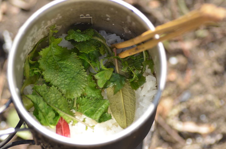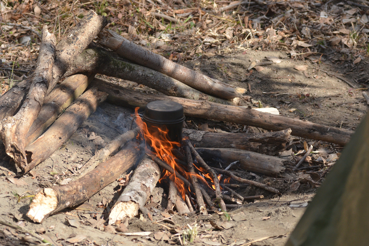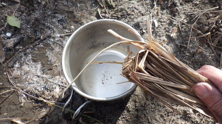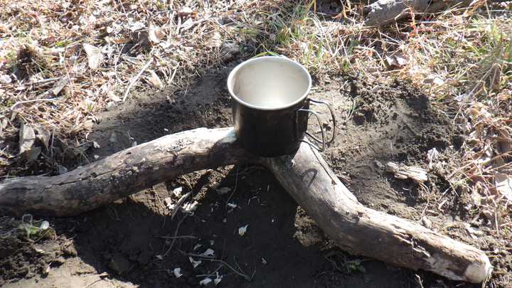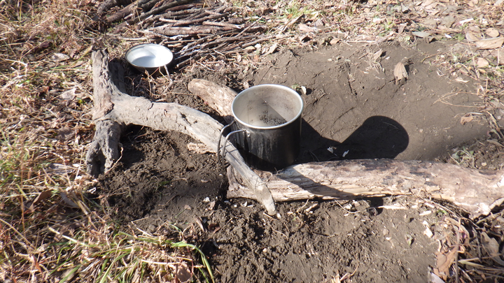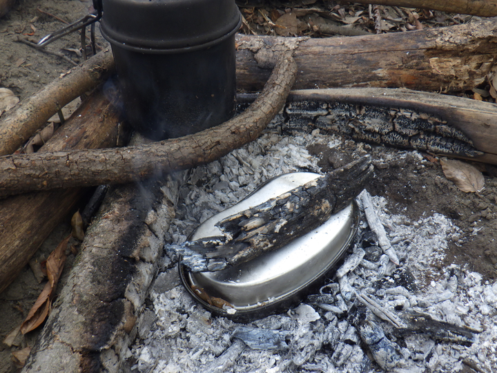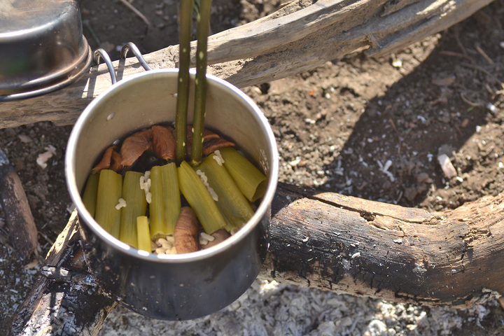 なんちゃって!?のサバイバル生活を続けてきましたが、自然から食材を採取したら、料理は自宅で・・・が、ほぼ全てでした。 ここでは、屋外での調理法を残します。 断っておきますが、今更ながら・・・初心者です。ドキドキ。 お米を炊く: 竹を使ってお米を炊きます。 方法は、縦置き型と横置き型の2種類があります。 今回は縦置き!! 理由はシンプル・単純・サバイバル!! 意味不明・・・ 写真は、左より、お米、アルミホイル、竹筒、紙パック(中は水です)、コップ。 竹筒にお米を入れ、水はお米の量の2倍が良い、置く場所は火が直接当たらない場所・・・ これが、いろいろなサバイバルの本に書いてあった知識でした。 写真は上記を忠実に守って再現・・・したはず・・・ 写真の炎は丁度小さめですが、もっと大きい時もありました。維持するのも意外と難しい・・・ これで20〜30分程度で炊き上がり、10分程度蒸らすと完成!! ・・・のはずが・・・ 炎が風でグルグル廻り・・・竹は熱いのですが沸騰している気がしない・・・ 初めチョロチョロ・・・の法則では、決して開けてはいけないと言われますが、最悪見ても問題ないとか・・・ 30分を経過し・・・中をみたら・・・水量そのまま、しかも沸騰してない!! 全く沸騰していなかったので、サバイバル本を無視してもっと炎の当たる場所へ移動・・・ 竹のあまりの熱さに倒してしまい、中の水が大分こぼれてしまいましたが、逆に良かったのでは!? との思いで燃やし続けました。 さらに30分程度たったでしょうか・・・竹は節の下が燃えて短くなり、全体が黒っぽく・・・ 写真右に写っているコップは、同時に作る予定のみそ汁。 大失敗!! かと、思いきや・・・意外にも炊けてる・・・かなりアバウトでも良いのでしょうか・・・ さすがに一番下の節近くはやや硬めでしたが、屋外料理ではこれも美味しいのです。 ハラハラ・ドキドキ、右往左往でしたが、意外にも成功と呼べる範囲には入りました。 同時に作ったみそ汁。 これは、竹筒にみそ汁の具・出汁・水を入れておき、焚き火で熱々状態の石を中へ投入して瞬間的に沸騰させる方法・・・ 石を投入したらジュッ!ボコボコ・・・と泡が出ました。 若干、灰も入りますが、殺菌されているので気にしなくて良いです。 とても簡単、これも成功。 今回は、とりあえず、こんな簡単な方法で挑戦してみました。 まだまだ沢山!いろいろな調理法があるので、機会があれば挑戦してみます。 焼き物。 自然の中にフライパンなどありません・・・今回は・・・ 朽ち木の中から生き物をGetしたのですが、道具を忘れ・・・ならば♪ 近くに大きな石があれば、それに載せて焼くのですが、石も無かったので、今回は朽ち木に載せて♪ そしてフライパンと違うのは、下から炙るのではなく、食材を石(今回は木)に載せたら、炎の近くに置き、食材を載せた面が炎に面する 様に角度を調節したら、焚き火をするだけ♪ ホクホクをどうぞ♪ 2016年に竹でご飯を炊いてから・・・ほんと、ほぼ何もやってない!! 6年が経過して2022年、やっと続きを♪ 今回は、タオル飯。 お米はあるけど、炊く器が無い!! そんなサバイバル状況下で使う技です!! ←そんな事ってある!? 今は5月上旬、雨後の快晴3日目、最高気温22度。 お米は前日の夜から水に浸けました。 日当たりの良い、砂地の河原に決め、直径30cm程の穴を掘りました。 まだ湿気てる・・・日差しが強いので、乾燥&温め・・・その間に、薪集め、食材探し、散策などなど・・・ 準備が出来たら、近くに落ちていた平べったくて黒っぽい石(温かい♪)を敷き詰めました。 ※石を敷き詰めずにやる場合もあります。また、敷き詰めた石の上に葉を何枚か敷き詰める方法も♪ そしたら・・・ タオル飯・・・やり方にバリエーションがありますが、今回私はオリジナル・・・ ご飯が炊けたときに、タオルにベトベトにくっ付いてしまうのを避けるため・・・タオルとお米の間に葉を敷き詰めました。 タオル・葉っぱ・お米・葉っぱ・タオル・・・と言う感じに。 ちなみに使った葉っぱは、アカメガシワとクズです。当然ですが、毒の無い植物の葉で、出来るだけ大きな物を使うと良いです。 ※タオルではなく、手拭いじゃん!! って言わないで下さい・・・これしか無かったんです♪ そしたら・・・そ〜っと・・・ この上に砂を2〜3cm程載せます。 砂まみれになってしまわないか、ちょっとドキドキ!! そしたら、上で焚き火をするだけ!! 木を組んだら・・・ファイヤー!! ご〜ご〜って!! ここで余談・・・ご飯を炊いて食べるだけではつまらん・・・ どうせ食べるならばカレー!! と言う分けでレトルトカレーも持ってきて・・・ トライポッドなど組んで一緒に温めるつもりが・・・常に使ってないとダメですね・・・ このクッカー、吊るすタイプじゃなかった!! 結局、いつものソロストーブで温めました・・・ 2つ上の写真の時がMAX炎でした。 タオルに包んだとは言え、僅かな水分・・・あ